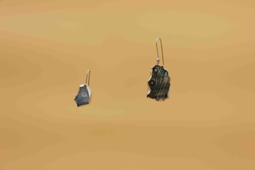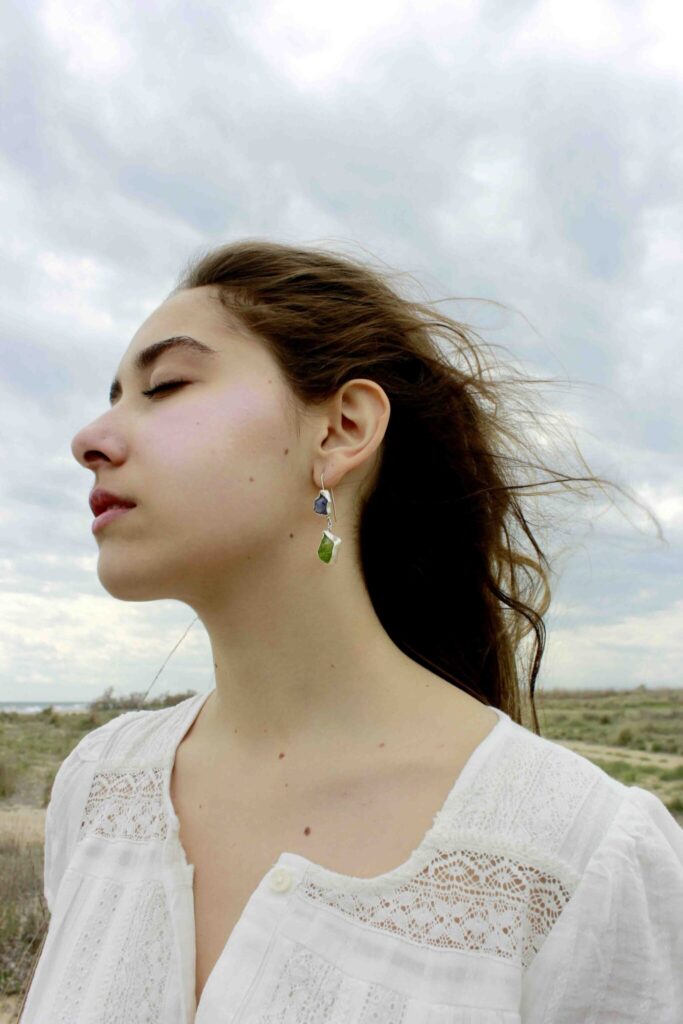Drop earrings featuring an aqua marine stone and an abalone. The earrings are part of the Tethys collection. Each piece is one of…