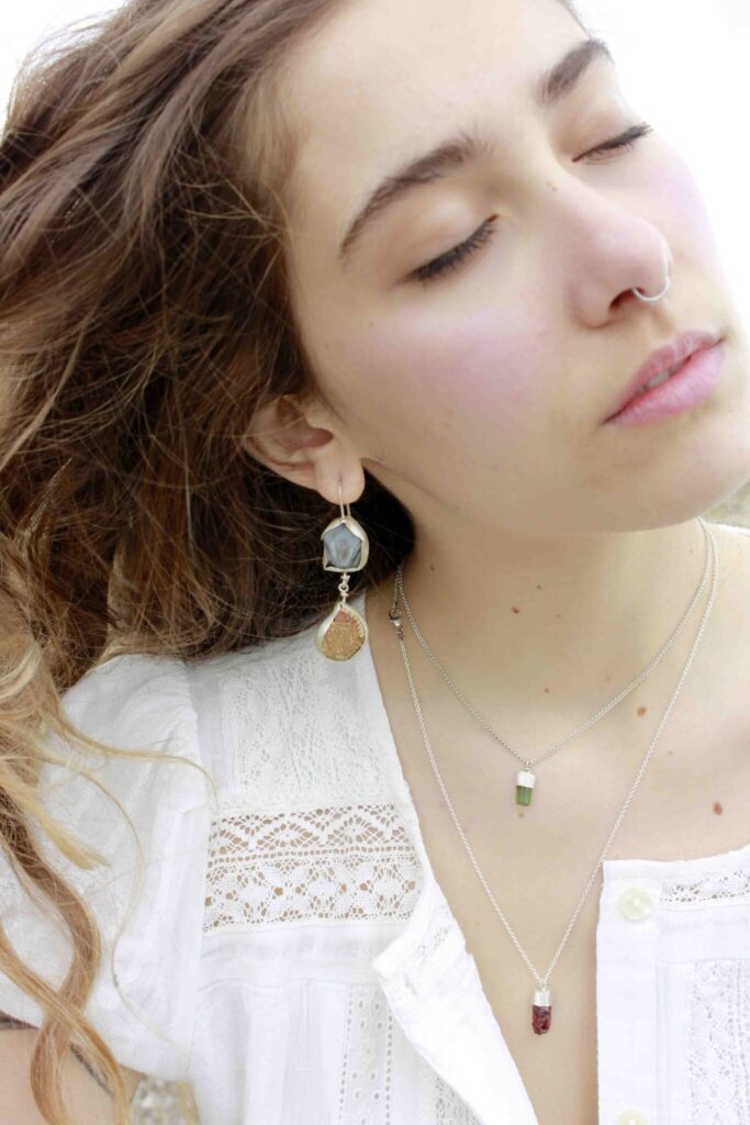 This long necklace features an abalone, an ammonite and a white amethyst. A bold statement necklace perfect for your summer outfits. The necklace…