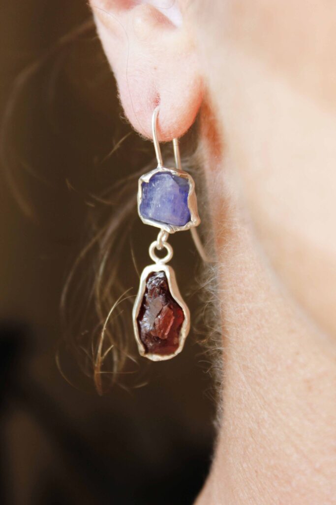 These drop earrings are featuring a Tanzanite and a Garnet stone each. Because of the nature of the stones, each piece is one…
